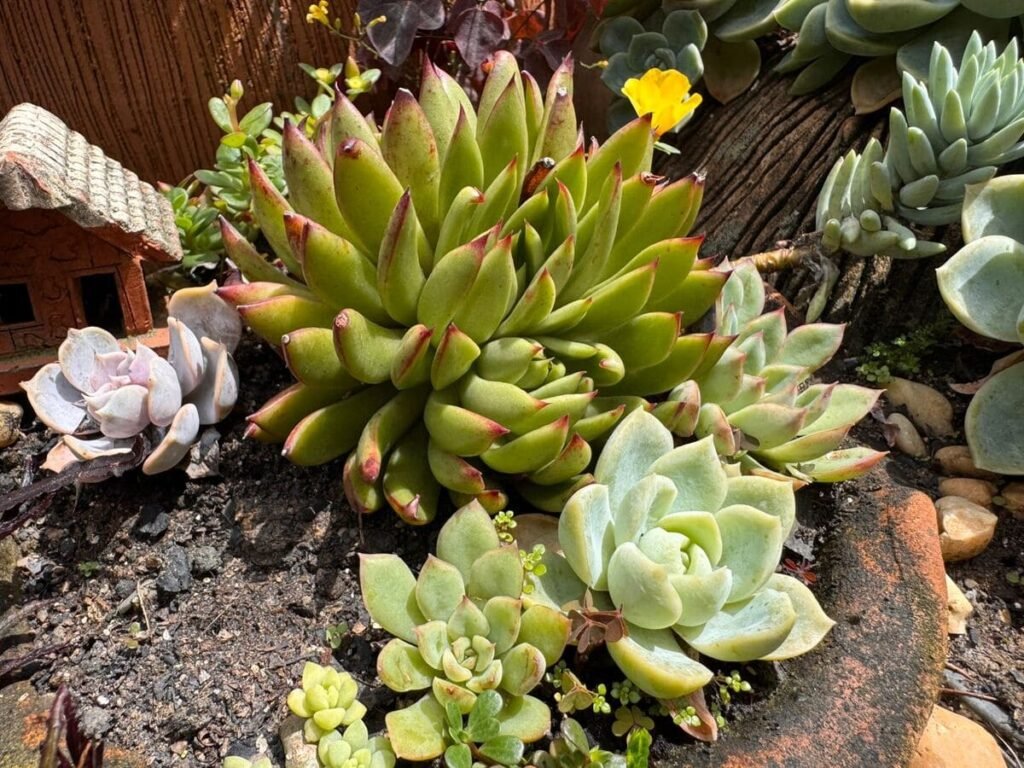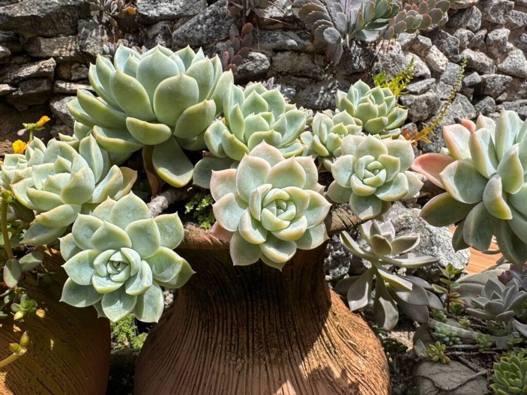 - Echeveria – clássica e colorida, com formato de roseta. Adora sol e pouca água.