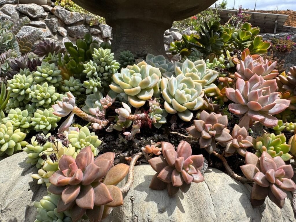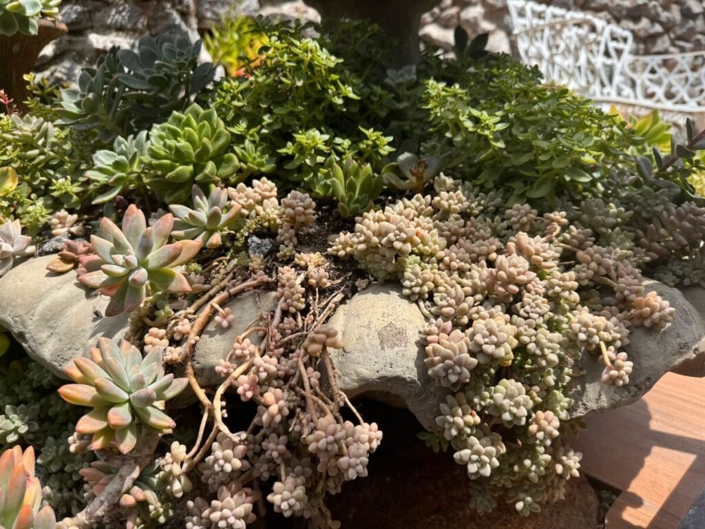 - Sedum morganianum (Dedinho-de-moça) – folhas delicadas em cascata, perfeita para sol pleno.